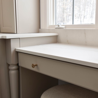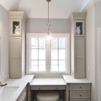 For the first time, the homeowners now have a dedicated vanity area — something that was a must-have from the beginning. Positioned to take advantage of natural light and paired with a sculptural pendant, it feels less like a utility and more like furniture within the room. That pendant, sourced from Uttermost, acts as the finishing jewelry of the space — a small detail that completes the composition and reinforces the layered approach throughout the design.