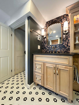 Welcome to the Deep & Moody Bath Retreat—a sultry sanctuary layered in texture, contrast, and charm. This space takes traditional bath design and flips the script, starting with an original exposed brick hearth nestled beneath natural maple cabinetry—a nod to the home's character and a cozy visual surprise. Against the dramatic navy-charcoal walls, the black clawfoot tub stands as a sculptural centerpiece, flanked by warm woven blinds and hits of greenery that soften the edge. Custom floral wallpaper peeks out behind the vanity, bringing in pattern play, while unlacquered brass fixtures and vintage-inspired hex tile ground the space in tactile elegance. Every design decision, from the bold color palette to the mix of modern lines and antique silhouettes, was made to turn a standard bathroom into a soulful, collected retreat. It’s proof that even the smallest spaces can have the biggest personalities.