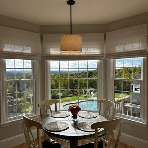 Timeless Charm with a View is where thoughtful elegance meets panoramic beauty. This light-filled project was all about celebrating the home's incredible natural surroundings while crafting interior spaces that feel just as striking. In the kitchen, we paired crisp white cabinetry with a bold, black island and rich leather barstools for contrast and warmth, topped with clean quartz surfaces that reflect the daylight pouring in from oversized grid windows. Our signature touch? Statement pendant lighting that adds architectural rhythm without distracting from the view. The two-story living room features a dramatic black-paneled fireplace wall, wood beam mantle, and layered textural accents that draw the eye up while grounding the space in cozy sophistication. Even the staircase was considered—classic white spindles, natural wood treads, and an elegant runner echo the home’s transitional charm. Every space was designed to highlight the views while feeling layered, livable, and distinctly elevated—because good design should always know when to step back and let the view shine.